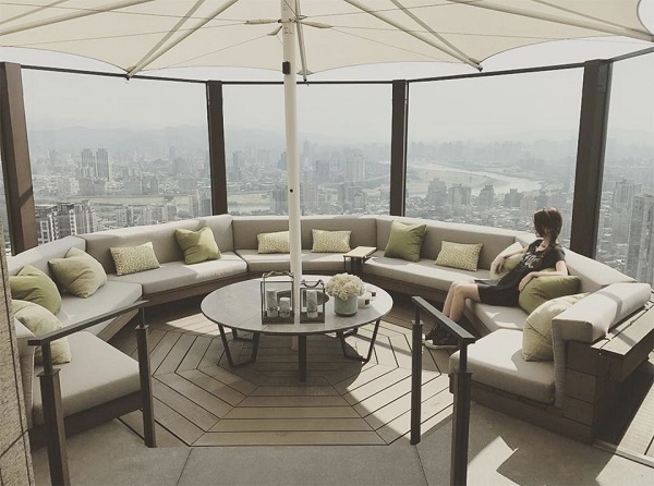 陽臺區(qū)域的設(shè)計了360度無死角鋼化玻璃,搭配木質(zhì)沙發(fā)及撞色抱枕。其中遮陽傘的設(shè)計可謂畫龍點睛, 讓昆凌坐在上面欣賞臺北景色的同時,又可以給她一種無拘無束、自由自在的放松感。