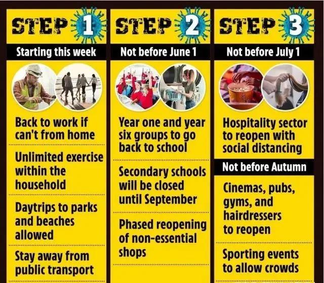 最近,英國(guó)公布了新的解封計(jì)劃,將分為三階段進(jìn)行解封:5月13日允許部分行業(yè)復(fù)工,6月初逐步開放學(xué)校,7月初重啟大部分經(jīng)濟(jì)。