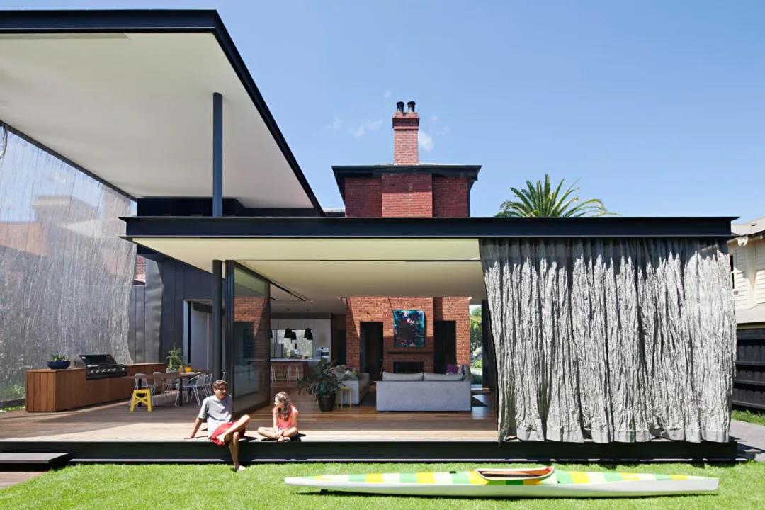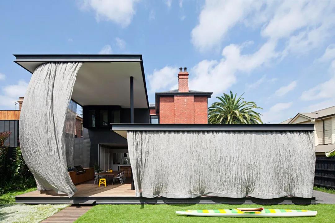 在澳大利亞,Matt Gibson建筑 + Design的建筑師在Hiro-En House中設(shè)計(jì)了一系列不同高度的檐篷和延伸物,通過(guò)模擬太陽(yáng)和陰影,適應(yīng)外部窗簾,以巨大的靈活性歡迎北方陽(yáng)光射入以及防止西側(cè)熱量和眩光。編織的不銹鋼網(wǎng)窗簾可以完全包裹在戶外甲板的北部和西部周邊,保護(hù)房子免受雨的侵襲,同時(shí)在炎熱的日子起到防曬霜的作用。