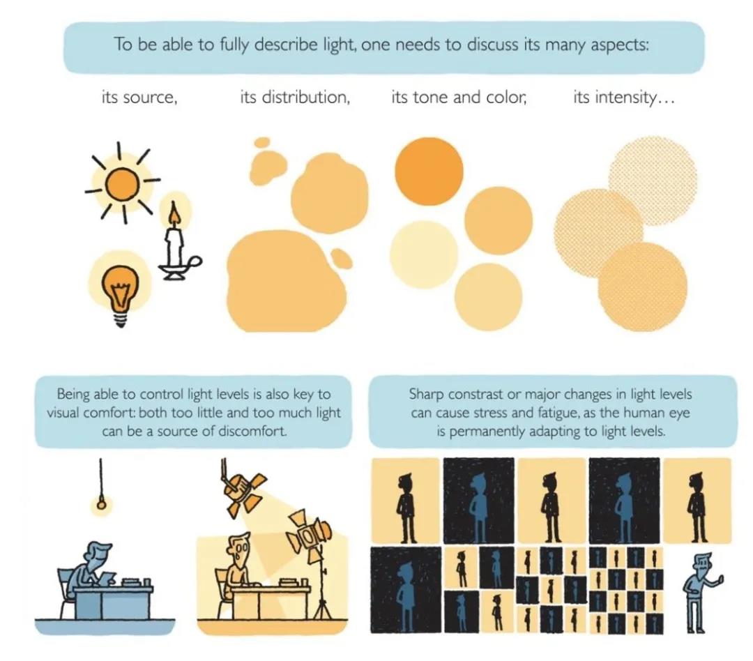 太少或者太多光都可能造成視覺不舒適。光線水平的重要變化或強(qiáng)對(duì)比 (被稱為眩光) 會(huì)導(dǎo)致壓力和疲勞,因?yàn)槿搜凼怯谰眠m應(yīng)光線水平的。