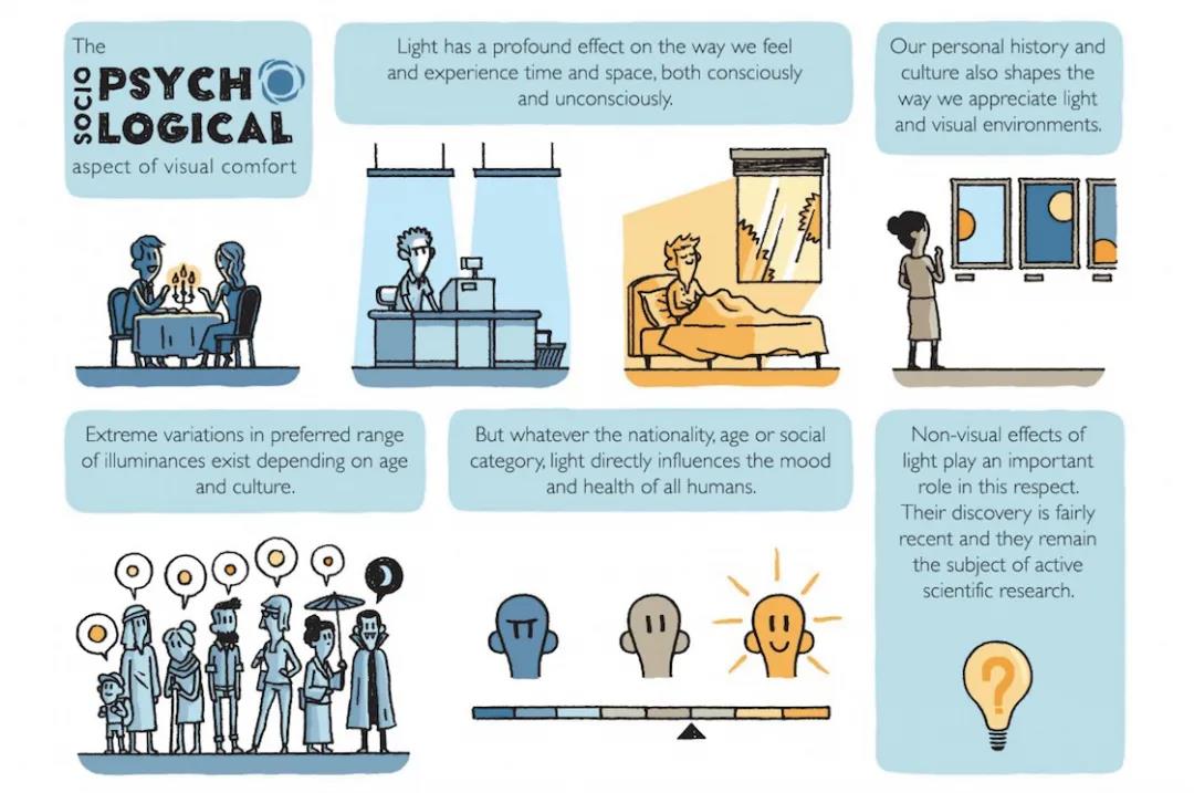 除了視覺上直觀的反應(yīng),人們?cè)谝粋€(gè)環(huán)境中的眨眼的頻率,刺眼的程度或者光盲區(qū)等是幫助確定室內(nèi)質(zhì)量的重要因素。其他還包括顏色表現(xiàn)、低反射和光線的均勻分布。設(shè)計(jì)時(shí),為了客戶可以很好地看清外面的景色,建筑圍護(hù)結(jié)構(gòu)中開口的數(shù)量和位置也是需要認(rèn)真思考的。